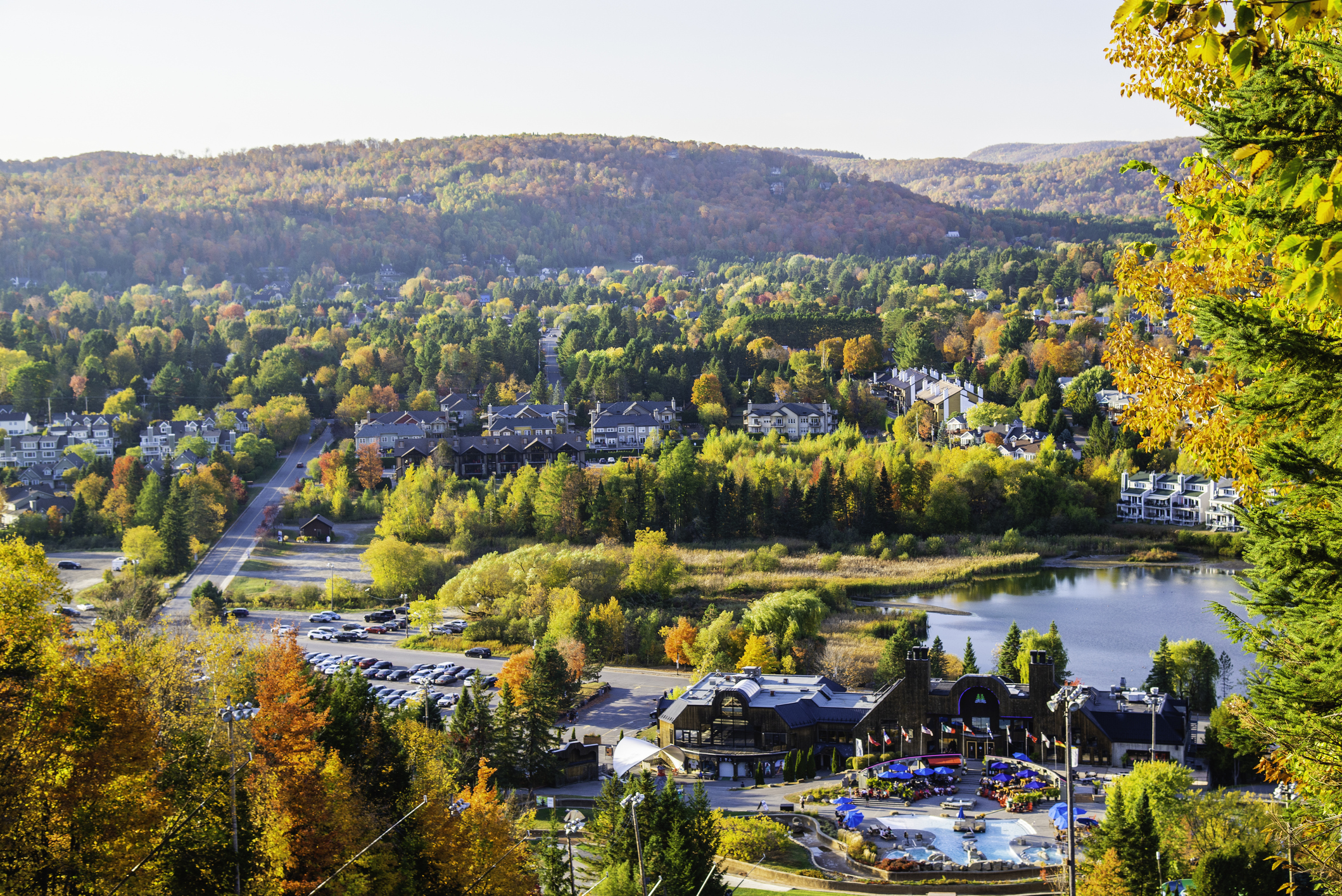 The beautiful panoramic autumn view from top of Saint-Sauveur mountain in Quebec Canada